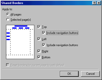 Shared Border es una parte del área de las páginas que se mantiene constante. Format > Shared Borders A diferencia de un Frame, un Shared Border puede quedar fuera del área visible de la página; No es independiente como el frame. Podemos considerar un Shared Border como una columna de una gran tabla que cubre toda la página, y que aparecerá en nuestras páginas si así lo queremos. |